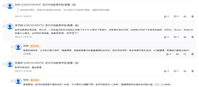直播课堂上教师教师清楚地传达了重要的课程主题、目标、学习活动的重要日期/时间安排,对如何参加课程学习活动提供了明确的指导。课中学习者认真听课,和老师及时互动,积极发言。直播课课后,直属及分校的学生及时在课程论坛中围绕老师上课的内容开展了深入的讨论,老师也在论坛中及时倾听、激励和反馈学习者的提问。课中课后师生社会互动、认知互动和情感互动及时、深入。