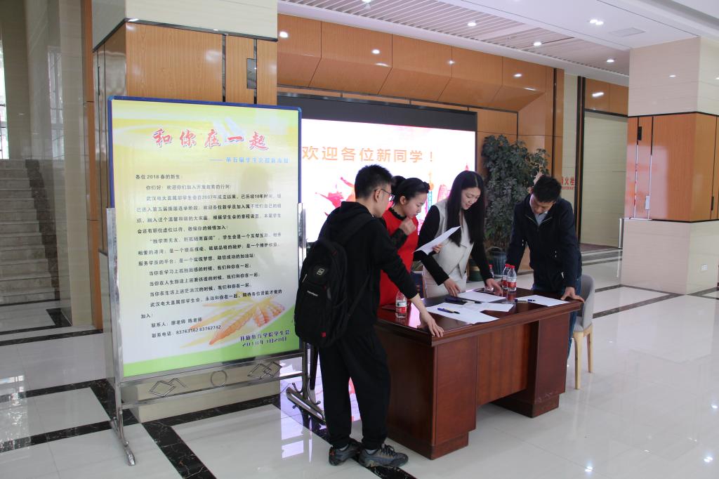3月25日上午,指导老师及学生会志愿者在一楼大厅为2018级春季新生做学生会宣传和报名工作。同学们都踊跃咨询,并根据自身情况和喜好积极报名。学生会志愿者为新生耐心的讲解各种疑问,并对每一位学生做好报名登记。接下来还会对表格进行筛选,安排组织面试竞选等环节。