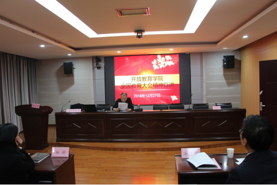 2018年12月27日下午,开放教育学院在汉口校区综合楼8楼大会议室召开了全员大会。大会由何书记主持,宣讲全国教育大会精神。