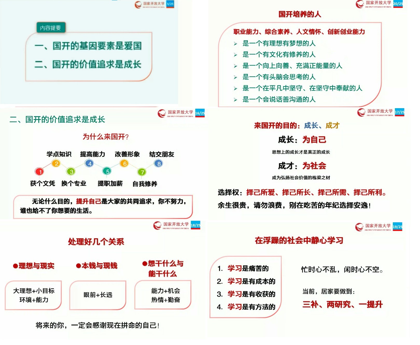 荆书记(校长)阐释了“成长是国家开放大学的价值追求”,希望大家奋发图强,阳光向上,做一个“讲政治、顾大局、听指挥、能战斗、重奉献”的国开人。在浮躁的社会中静心学习,要做到三补、两研究、一提升。要求处理好理想与现实、本钱与现钱、想干什么与能干什么三组关系。
