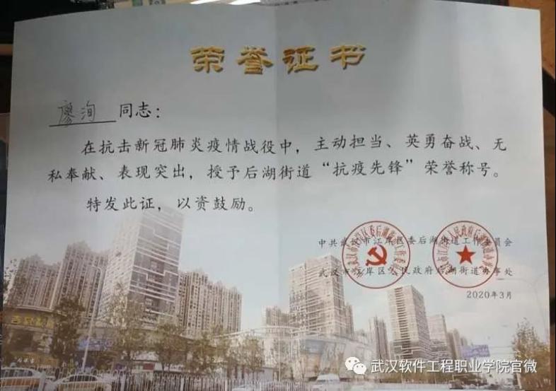 廖洵将计算机技能运用到防疫工作中,17个社区的1000多条疫情数据,他一一收集、整理、汇总,制作成疫情数据表上报给后湖街道,保持数据与疫情信息平台同步。他认真完成电话回访任务,及时反馈、更新患者的治疗及康复状态,为疫情防控贡献一份力量,被授予“抗疫先锋”荣誉称号。