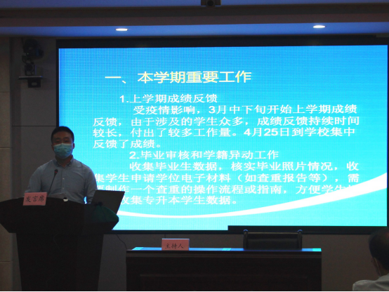 会议由王鹰院长主持,会议全程持续了三个小时。会上各位分管领导分别对2020春季学期招生、教学、教务、学生等方面的工作进行小结,对暑期及2020秋的相关工作做了布置。王鹰院长对于大家在坚持抗疫的同时克服困难出色完成了各项工作表达了充分肯定,分别对各部门的工作进行重要点评。并强调了暑期需要完成的重点工作。最后和大家分享了体会:忧患意识、责任意识、创新意识,忧患意识就是一种内在的担当;责任意识不仅是一种能力,更是一种品格和精神的反映;有了创新意识才有发展。强调学院各项工作的推进及取得的成绩就是因为有这三种意识。要求大家接到工作任务后要快速反应、精细落实、齐心协力完成。