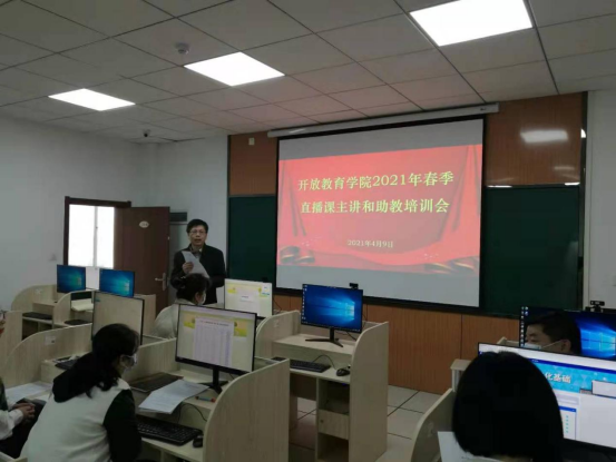 (通讯员:肖驰 摄影:刘江山)4月9日上午,开放教育学院组织召开“基于国开学习网直播课助学教师培训会”。本次培训旨在让助学教师们熟悉国开学习网课程直播功能、督促学生参与学习网直播课学习、维护网上教学秩序,规范学生收看直播纪律,确保直播课教学顺利开展。开放教育学院院长张旋、副院长凃明星、全体直播课助学教师及信息中心技术人员参加本次培训。