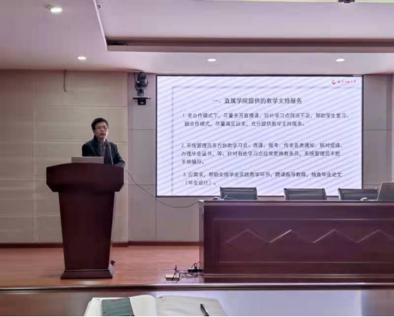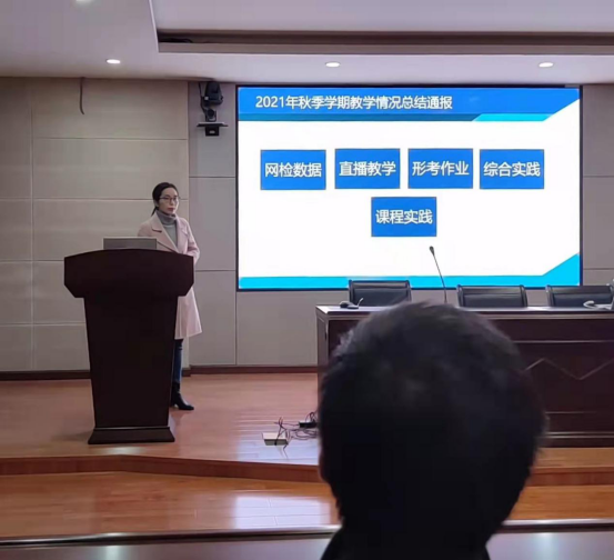 首先教务科科长疏凤芳对2021年秋季学期教学情况进行总结通报。疏科长从网检数据、直播教学情况、形考作业、综合实践、课程实践五个方面介绍了相关情况,要求各学习点规范教学管理、落实教学过程。