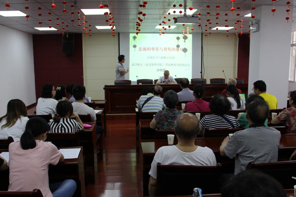 第四项,联系实际讲党课。长寿社区书记黄剑给党员讲了《不忘初心、牢记使命》主题教育党课。我院党总支副书记凃明星运用图片资料和视频,讲了题为《忠诚的尊荣与背叛的代价》的党课。