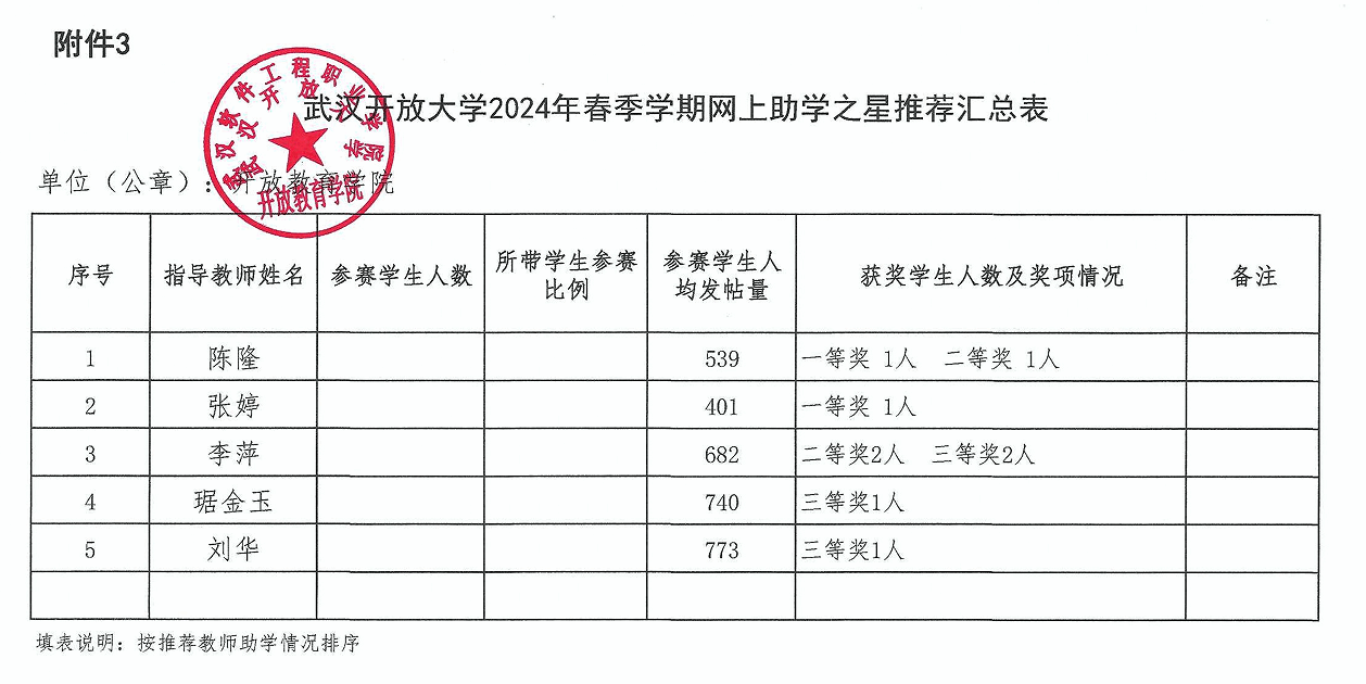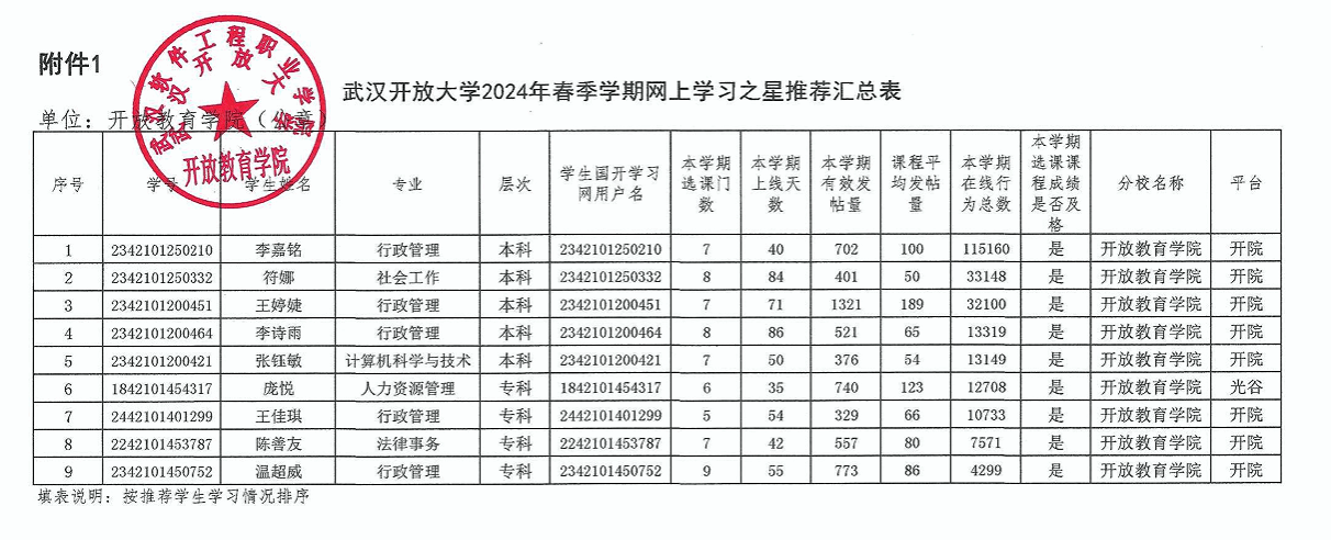 根据武汉开放大学2024年春季“网上教学三星”活动评选要求,经评审,现将2024年春季“网上学习之星”、“网上助学之星”开放教育学院获奖推荐人选予以公示(名单附后)。公示时间为:2024年9月12日至2024年9月19日。