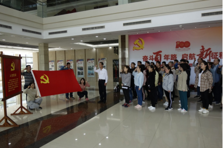 进入展馆后,在开放教育学院党总支书记赵文锋的带领下,全体党员师生在庄严的党旗面前重温入党誓词,庄严宣誓。